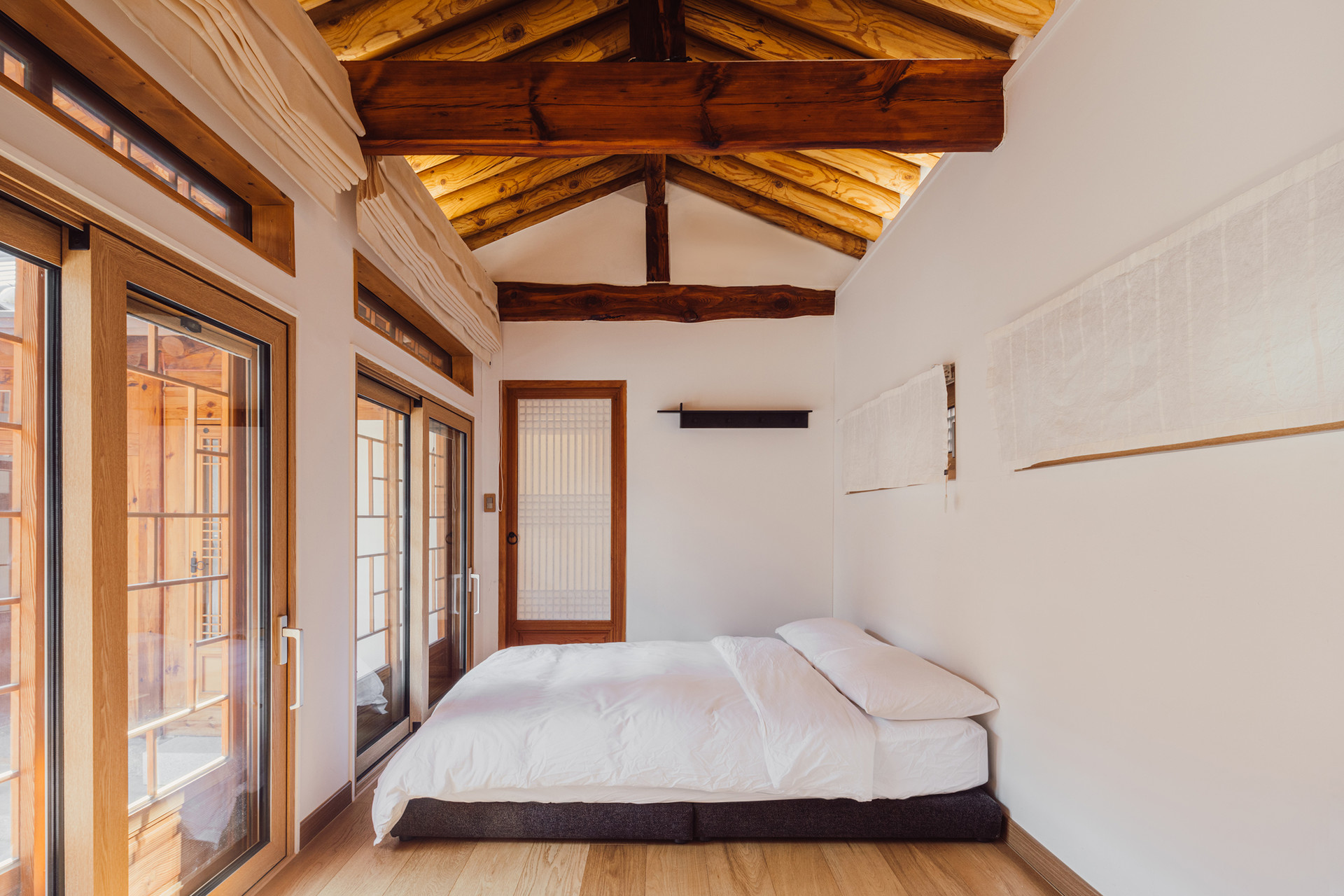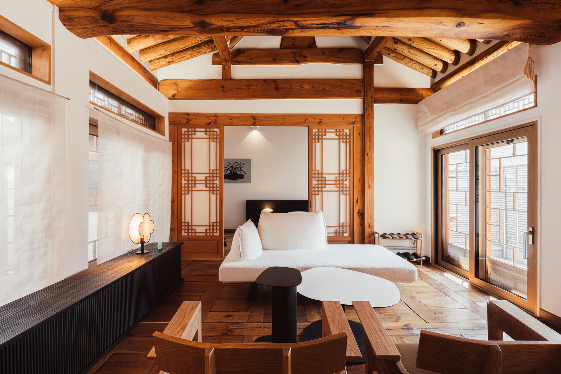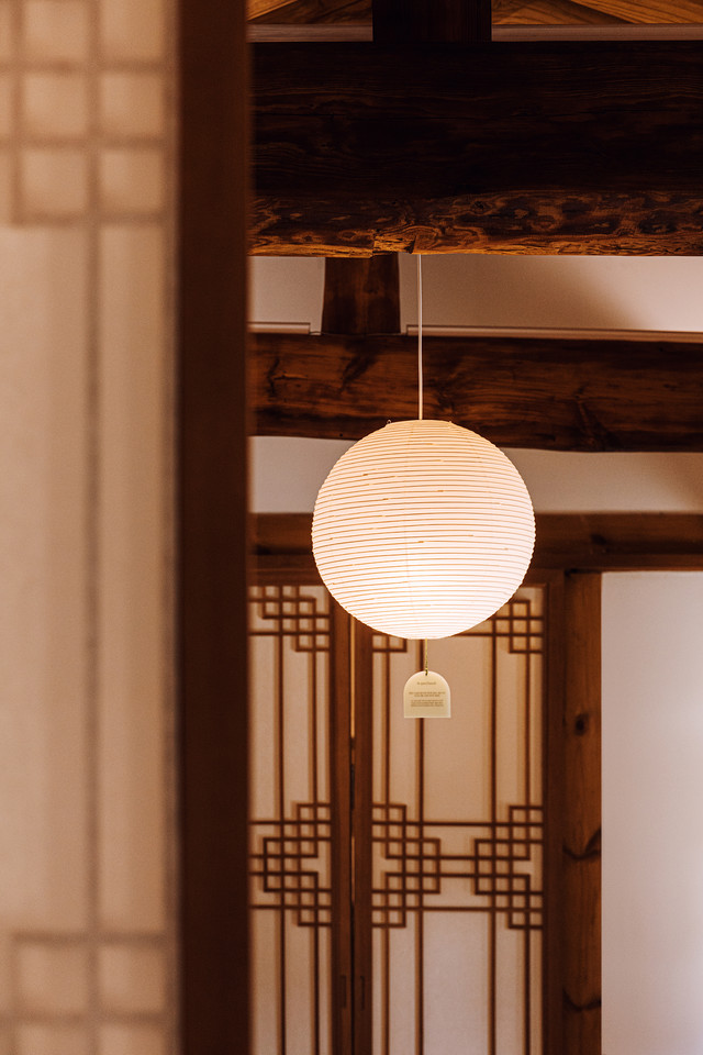 Soft hanji fabric and blinds by Somidang frame the windows, allowing natural light to filter in with a warm, gentle glow.